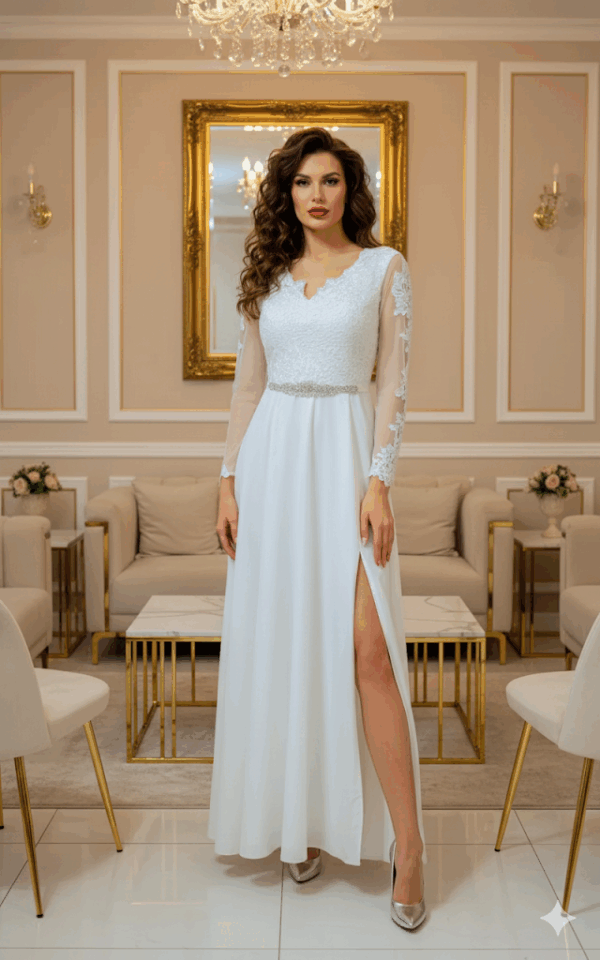A V-kivágott dekoltázs kiemeli a nyakat és a vállakat, míg a felsőrészét necc anyagon hímzett csipke díszíti, amely finom és romantikus megjelenést biztosít. A mell alatt szabott vonal kiemeli a derékrészt és karcsúsítja a sziluettet, míg az alsó szoknyarész csillogós anyaga egyedi fényt ad a ruhának.