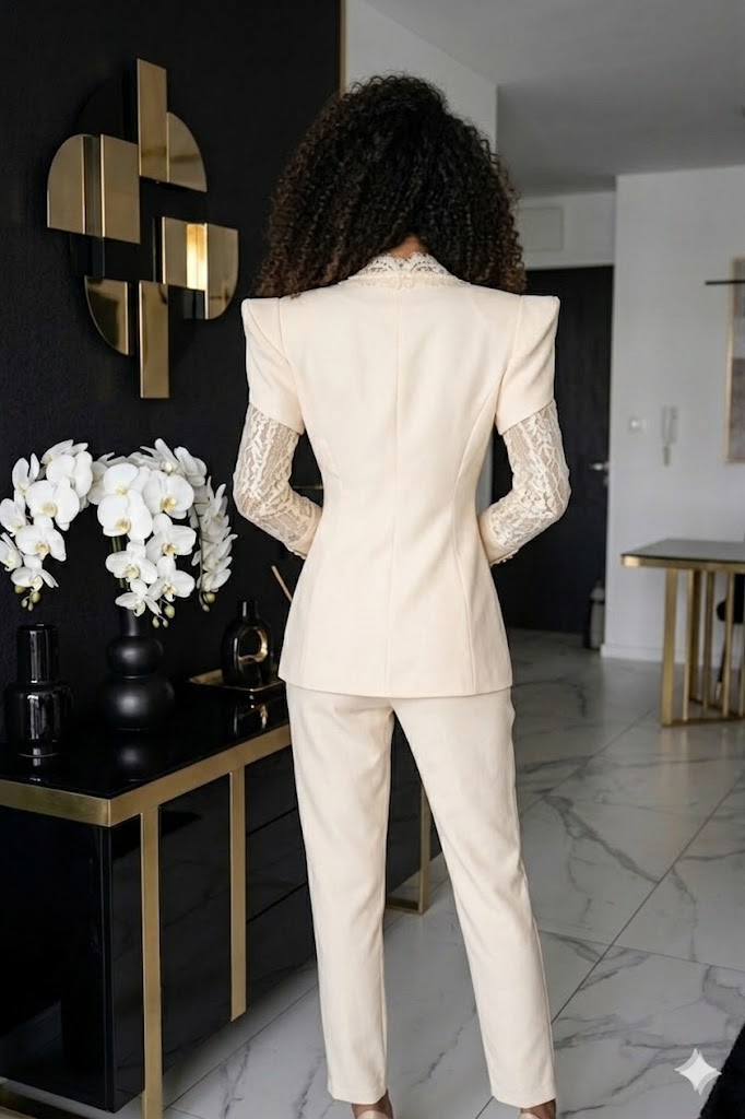 A Jamina csipkés nadrág kosztüm a modern elegancia és a romantikus részletek tökéletes kombinációja. A karcsúsított zakó V nyakkivágása és puffos, válltöméses vállrésze erőteljes, mégis nőies sziluettet teremt. A hosszú, áttetsző csipke ujjak különleges és elegáns megjelenést kölcsönöznek a szettnek, amelyet az arany gombos záródás tesz igazán kifinomulttá.