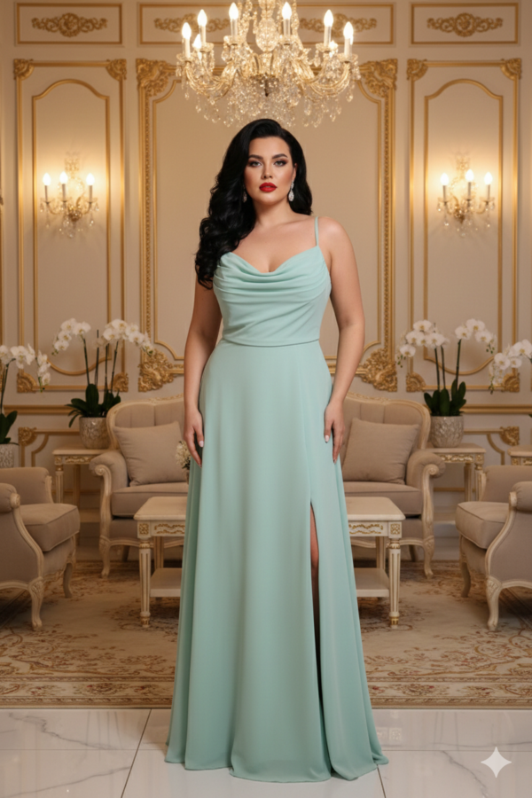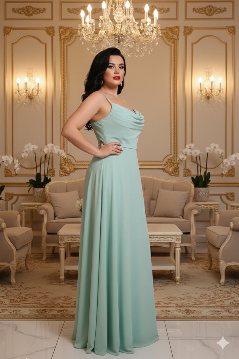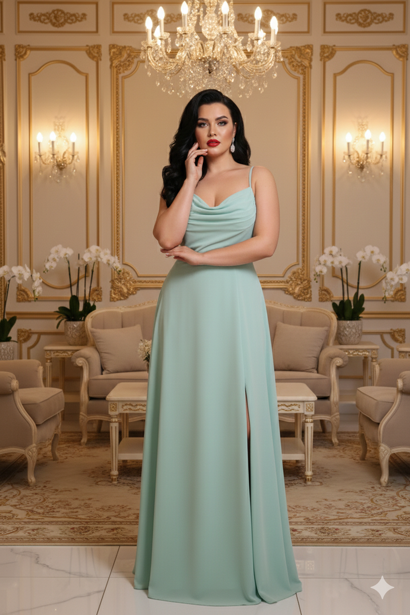 Ez a menta színű, muszlin anyagból készült maxi ruha a letisztult elegancia és nőiesség tökéletes egyensúlya. A kámzsanyak különleges, lágy esésű szabásvonala kiemeli a nyakat és a dekoltázst, míg a spagetti pántok légies könnyedséget kölcsönöznek a megjelenésnek.