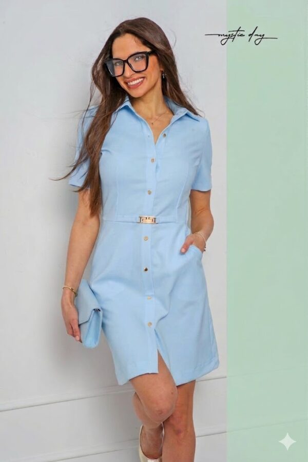 Az elől gombos záródás nemcsak stílusos, hanem praktikus is, a galléros kialakítás pedig letisztult eleganciát ad a megjelenésnek. A derékrésznél található dísz övcsat kiemeli a nőies vonalakat, így ez a ruha tökéletes választás munkába, esti programokra vagy akár különleges alkalmakra is.