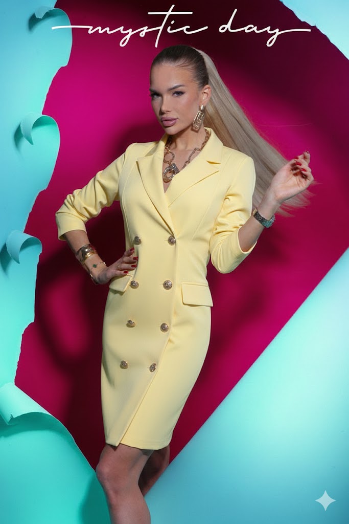 Az elől gombos záródás nemcsak stílusos, hanem praktikus is, a galléros kialakítás pedig letisztult eleganciát ad a megjelenésnek. A derékrésznél található dísz övcsat kiemeli a nőies vonalakat, így ez a ruha tökéletes választás munkába, esti programokra vagy akár különleges alkalmakra is.