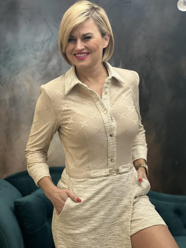 A Karolina Zita rövid overál egy igazi különlegesség a Cool Fashion kollekciójában. A nyomott mintás anyag modern stílust képvisel, miközben a derékban szabott fazon nőies és előnyös sziluettet kölcsönöz.