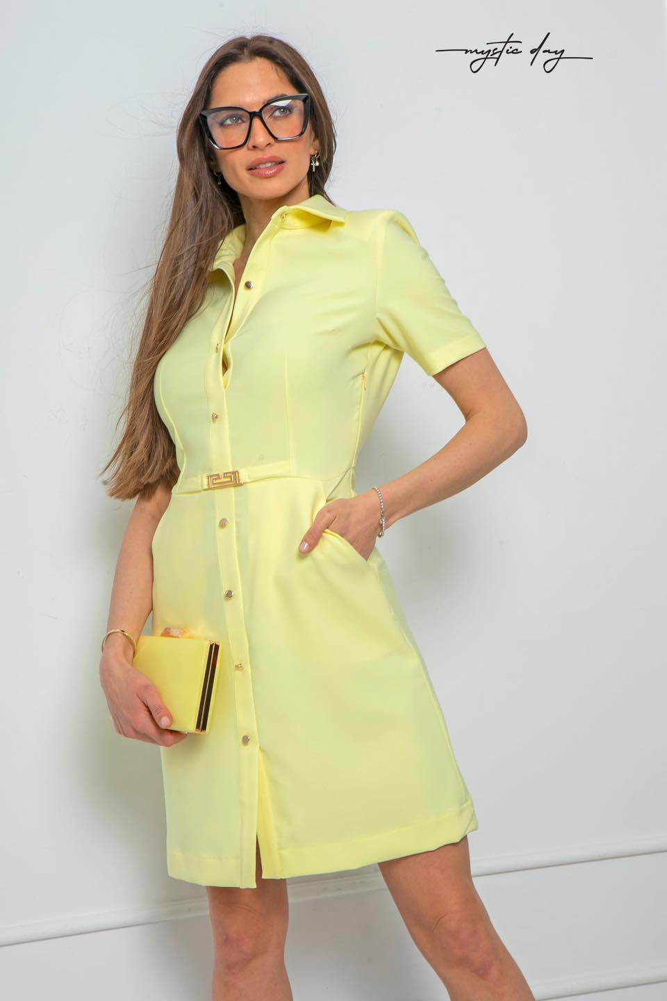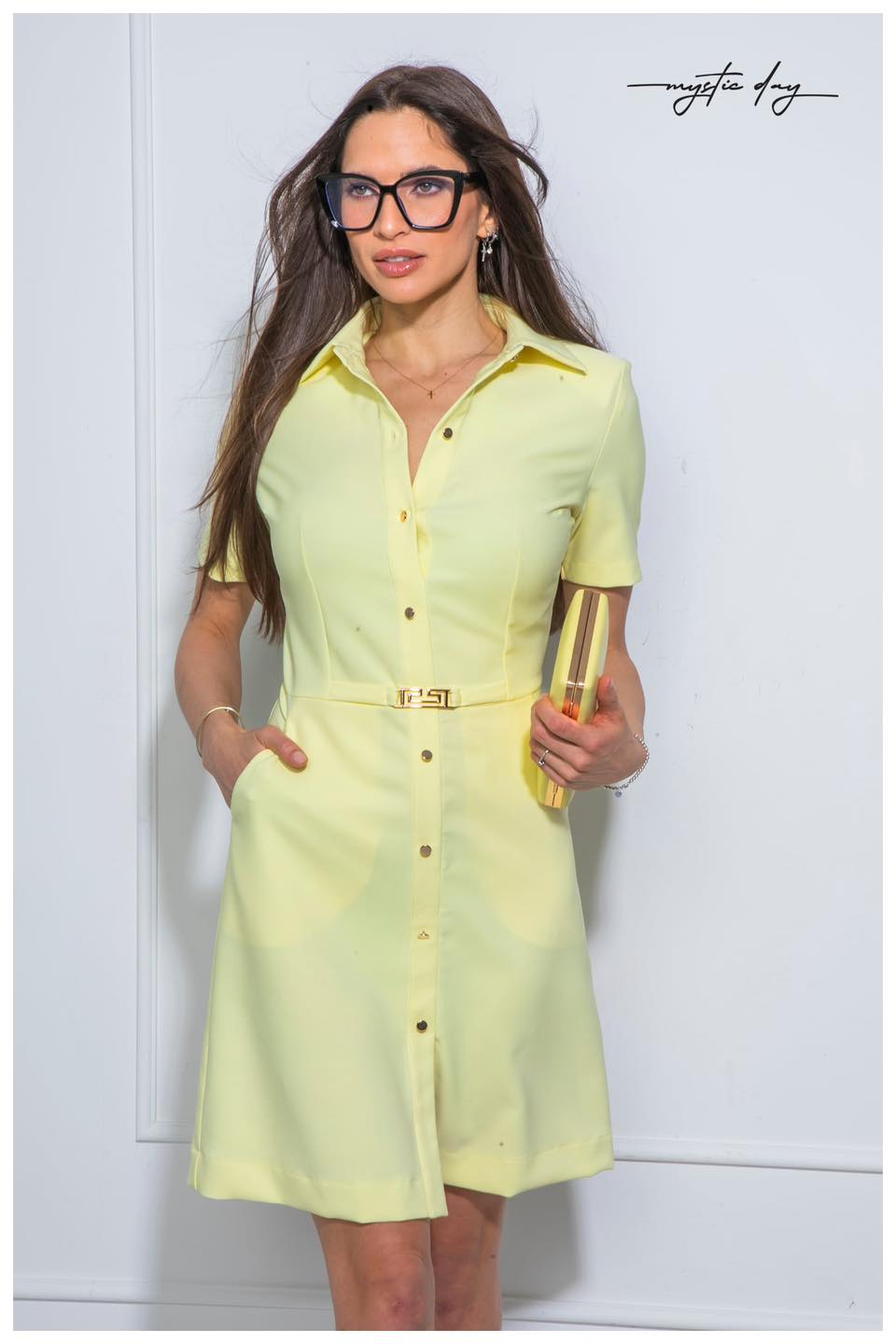 Az elől gombos záródás nemcsak stílusos, hanem praktikus is, a galléros kialakítás pedig letisztult eleganciát ad a megjelenésnek. A derékrésznél található dísz övcsat kiemeli a nőies vonalakat, így ez a ruha tökéletes választás munkába, esti programokra vagy akár különleges alkalmakra is.