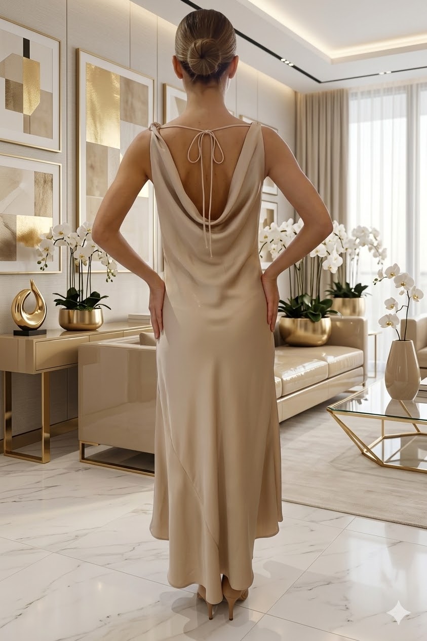 A Karyna szatén maxi ruha egy igazán elegáns és nőies darab, amely a letisztult stílust és a különleges részleteket ötvözi. A lágyan omló szatén anyag luxus hatást kölcsönöz a ruhának, míg a kámzsás nyakkivágás finoman hangsúlyozza a dekoltázst és elegáns esést ad a felsőrésznek.