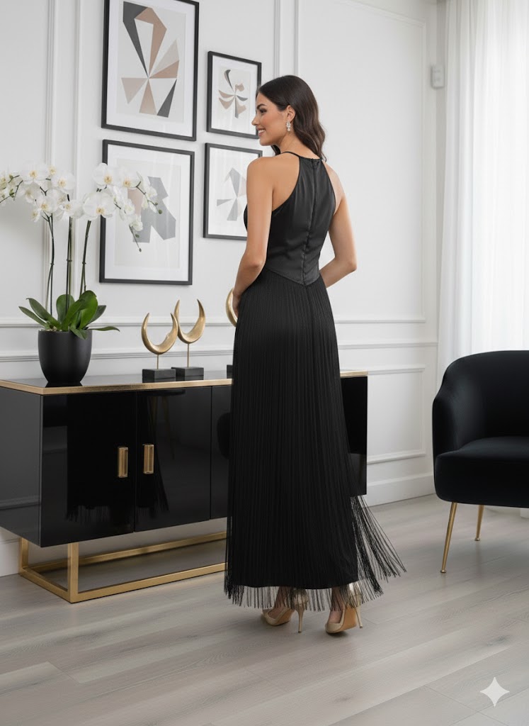 A ruha egyik legkülönlegesebb eleme a rojtos kialakítás, amely mozgás közben életre kel, így igazán feltűnő és dinamikus hatást kelt. Az elöl sliccelt szoknyarész nemcsak kényelmes viseletet biztosít, hanem finoman hangsúlyozza a lábakat is. Rugalmas anyagának köszönhetően komfortos, mégis csinos választás, míg a hátán elhelyezett cipzár megkönnyíti a felvételt.