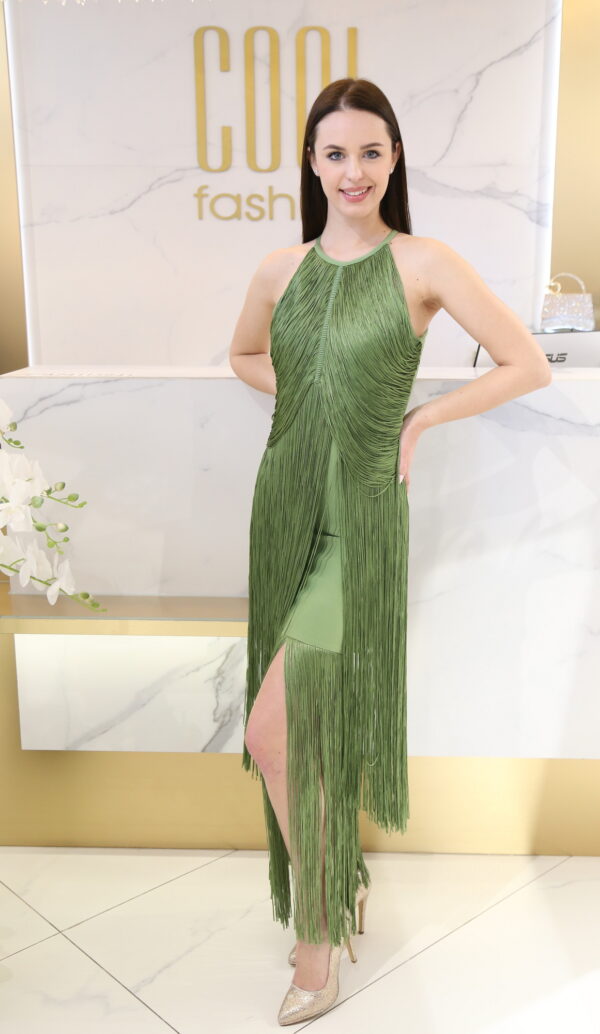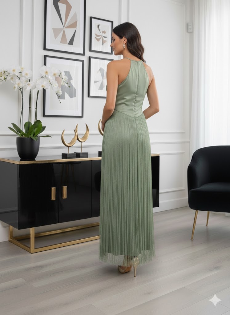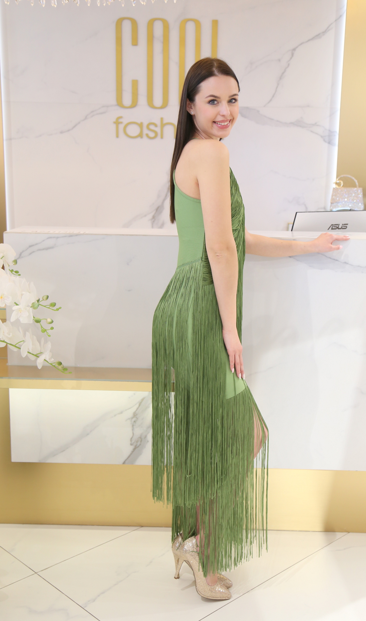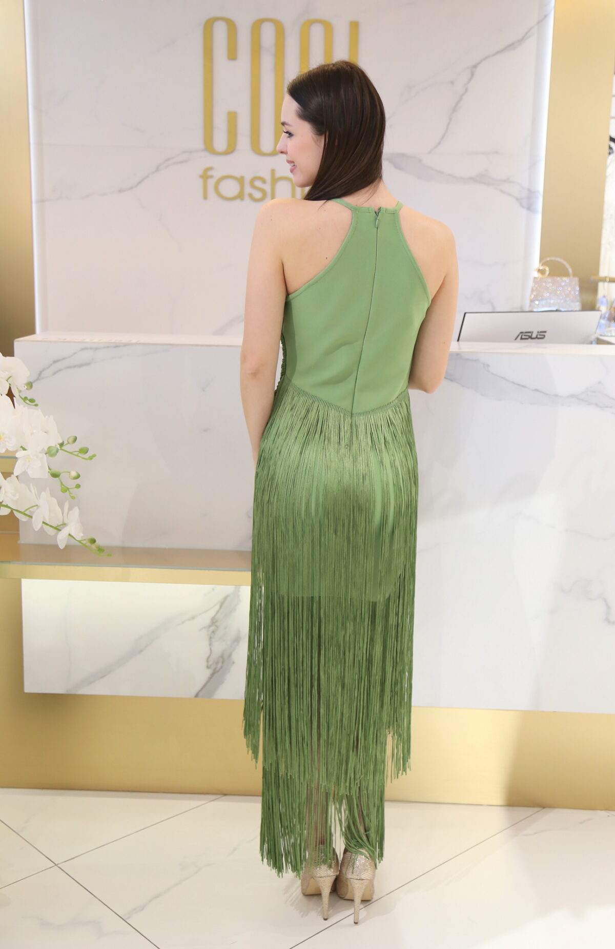 A ruha egyik legkülönlegesebb eleme a rojtos kialakítás, amely mozgás közben életre kel, így igazán feltűnő és dinamikus hatást kelt. Az elöl sliccelt szoknyarész nemcsak kényelmes viseletet biztosít, hanem finoman hangsúlyozza a lábakat is. Rugalmas anyagának köszönhetően komfortos, mégis csinos választás, míg a hátán elhelyezett cipzár megkönnyíti a felvételt.