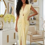 A Kiera csavart midi ruha tökéletes választás azok számára, akik egy kifinomult és elegáns darabot keresnek. Dekoltált, ujjatlan fazonja gyönyörűen kiemeli a nőies vonalakat, míg a válltöméses kialakítás modern és határozott megjelenést kölcsönöz. A mellrésznél csavart részlet különleges és egyedi megjelenést ad a ruhának, a felsliccelt szoknya pedig elegánsan nyújtja az alakot.