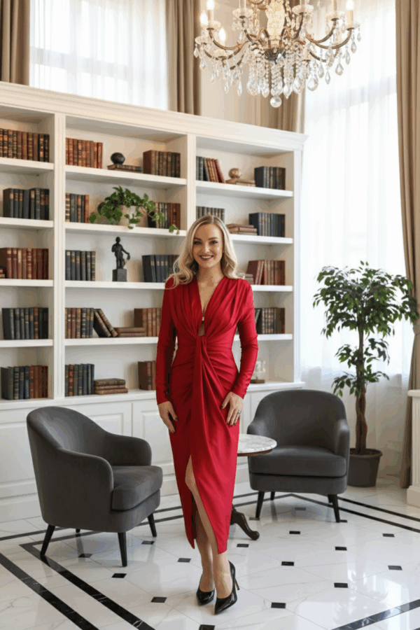 A Kiera csavart midi ruha tökéletes választás azok számára, akik egy kifinomult és elegáns darabot keresnek. Dekoltált, hosszúujjú fazonja gyönyörűen kiemeli a nőies vonalakat, míg a válltöméses kialakítás modern és határozott megjelenést kölcsönöz. A mellrésznél csavart részlet különleges és egyedi megjelenést ad a ruhának, a felsliccelt szoknya pedig elegánsan nyújtja az alakot.