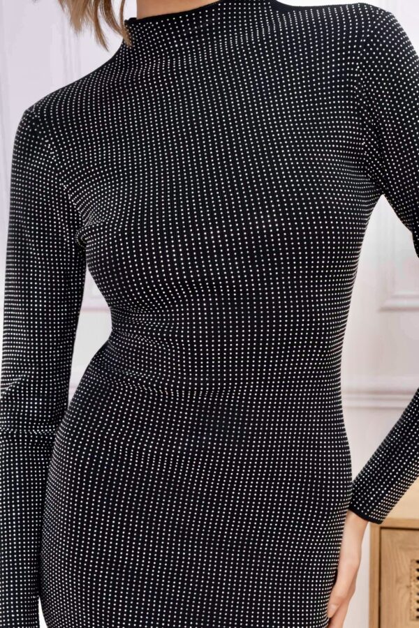 A magas nyakú kialakítás modern és előkelő hatást kelt, a hosszú ujjú, testhez álló fazon pedig csinos, karcsúsító sziluettet formál. A ruha hátulján nincs köves díszítés, így nem szúr, nem dörzsöl, és különösen kényelmes viselet. A hátsó cipzár megkönnyíti a felvételt és letisztult hátvonalat biztosít.