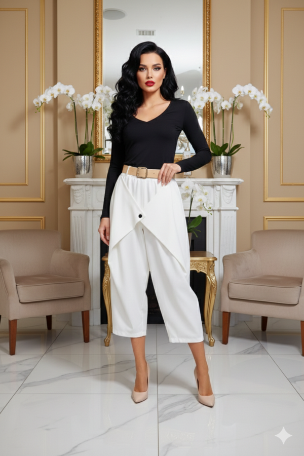 A nadrághoz tartozó öv kiemeli a derekat, a zsebes kialakítás pedig praktikussá teszi a mindennapi használat során. Tökéletesen kombinálható szűk felsőkkel, blúzokkal vagy akár sportosabb darabokkal is, így sokoldalúan beilleszthető a hétköznapi és divatos outfitek közé.