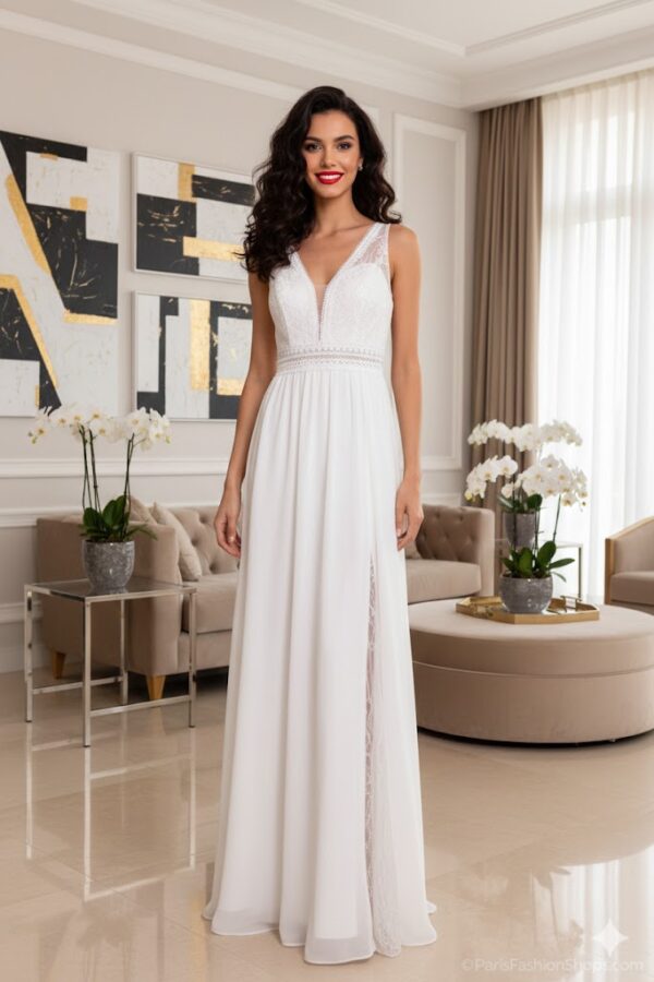 A derékban szabott fazon karcsúsítja az alakot, az alatta leomló muszlin szoknyarész pedig könnyed, légies mozgást ad a ruhának. A csipkés sliccelés különleges és nőies részlet, amely finoman megmutatja a lábakat járás közben.