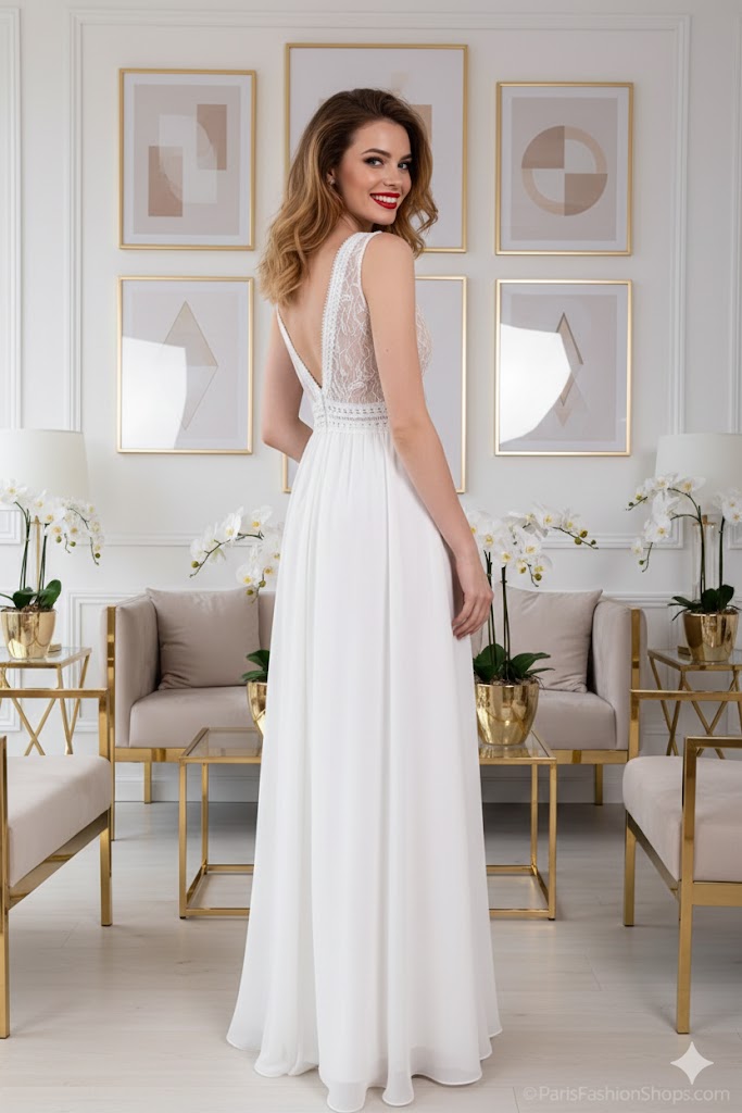 A mélyen kivágott, csipkés hátrész igazán látványos megoldás, amely emlékezetessé teszi a megjelenést. Nem elasztikus anyagának köszönhetően a ruha elegáns tartást ad, így ideális választás esküvőkre, alkalmi eseményekre, bálokra vagy akár menyasszonyi ruhának is. Az ekrü árnyalat tovább fokozza a ruha időtlen, romantikus hangulatát.