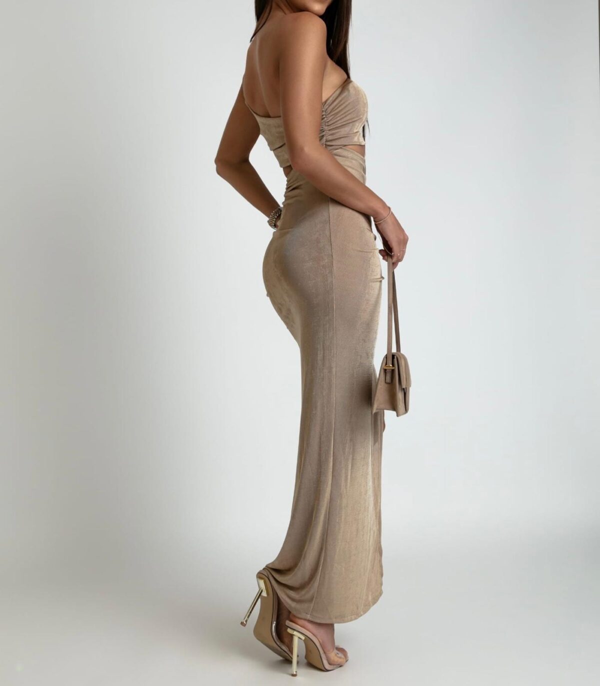 A drapp arany félvállas ruha egy igazán exkluzív darab, amely az eleganciát és a modern nőiességet tökéletes harmóniába hozza. A testhez álló szabás kiemeli az alakot, miközben a ráncolt hasrész finoman formálja a sziluettet, segítve az előnyös megjelenést.