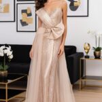 A ruha derékban szabott, így optikailag formálja és karcsúsítja a sziluettet. A különleges megjelenést tovább fokozza a masnival díszített oldal uszály, amely elegánsan megnyújtja a ruhát, és minden lépésnél látványos mozgást biztosít. A hátsó cipzáras záródás kényelmes viselhetőséget és tökéletes illeszkedést garantál.
