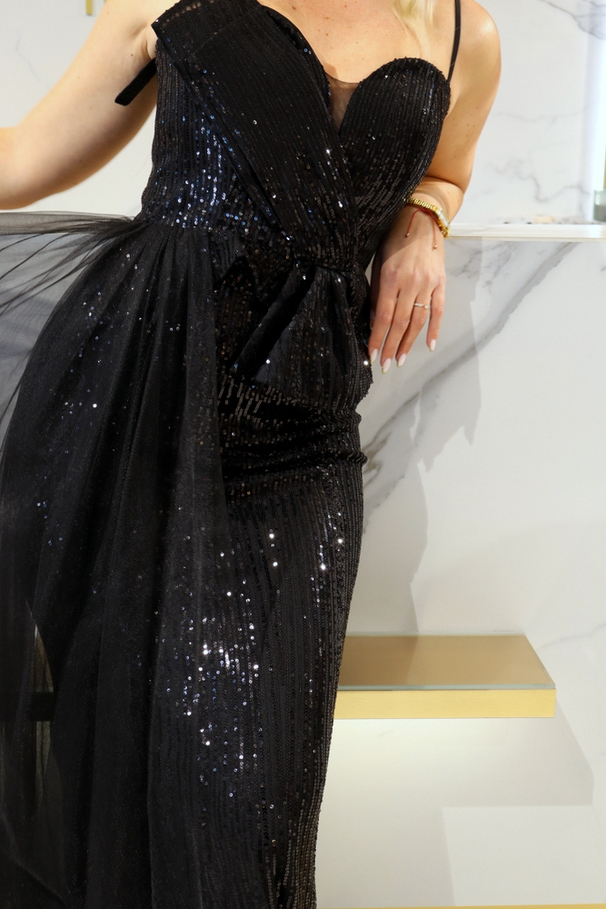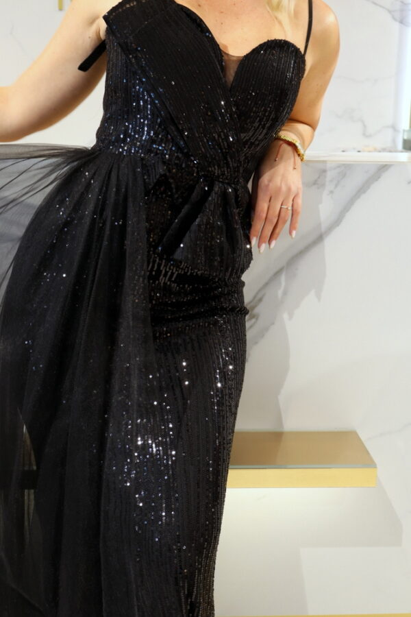 A Lina fekete flitteres oldal uszályos maxi ruha az elegancia új szintjét képviseli. A ruha teljes felületét csillogó flitterek borítják, amelyek gyönyörűen tükrözik a fényt, mozgás közben pedig látványosan életre kelnek. A mély, nőies dekoltázs kifinomult és vonzó megjelenést ad, míg a spagetti pántok könnyed, modern stílust biztosítanak.