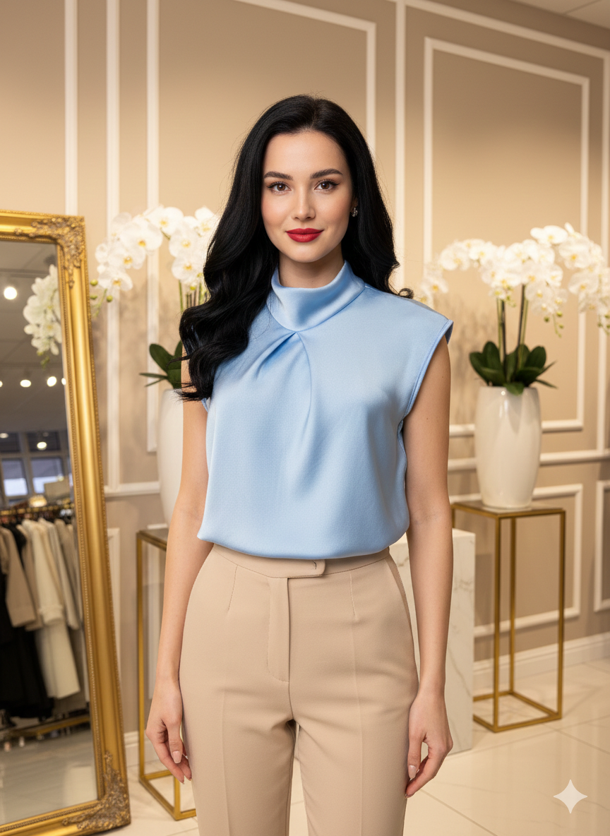 A Lori ujjatlan szatén blúz a letisztult elegancia tökéletes példája. A selymes fényű szatén anyag azonnal exkluzív megjelenést ad, miközben a laza szabás gondoskodik a kényelmes viseletről egész nap. A magas nyak elegáns keretet ad a felsőrésznek, így önmagában is különleges darab, nem igényel túl sok kiegészítőt.