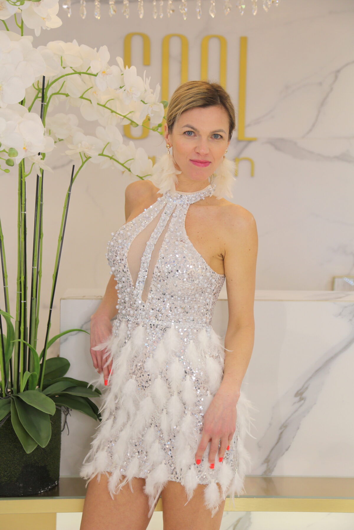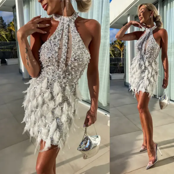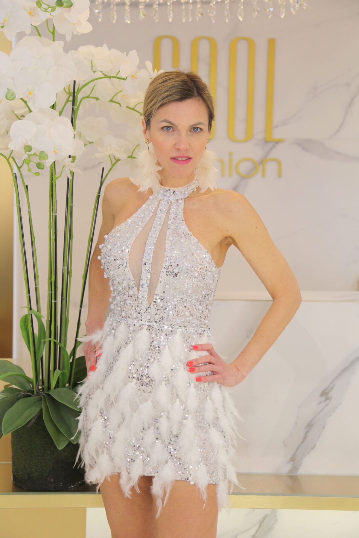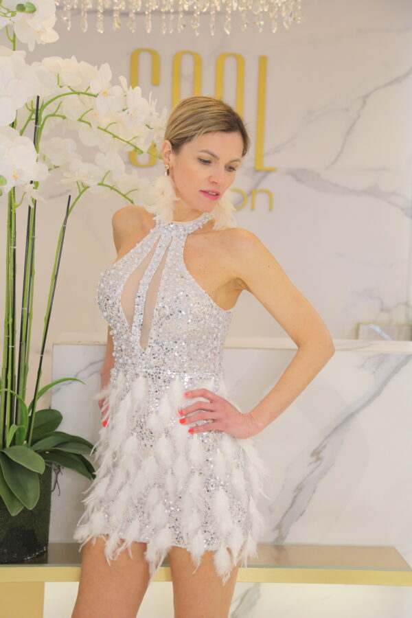 A Lorina ezüst tollas mini ruha igazi statement darab, amely a flitterek csillogását és a tollas szoknyarész extravaganciáját ötvözi. A magas nyakú, ujjatlan felsőrész elegáns keretet ad, miközben a necc betétek és a mély dekoltázs merész, mégis kifinomult összhatást teremtenek. A szivacsos mellrész biztos tartást nyújt, a minimálisan rugalmas anyag pedig szépen követi az alak vonalát.