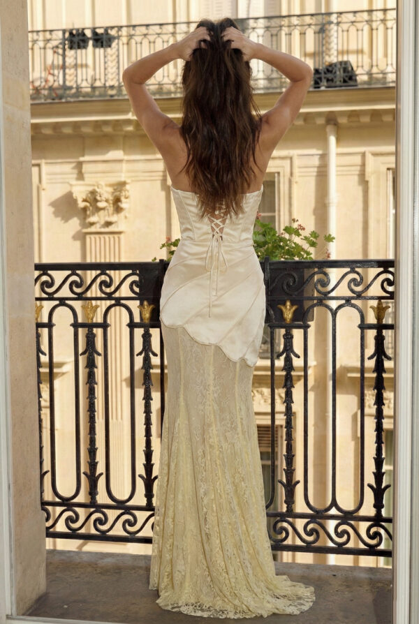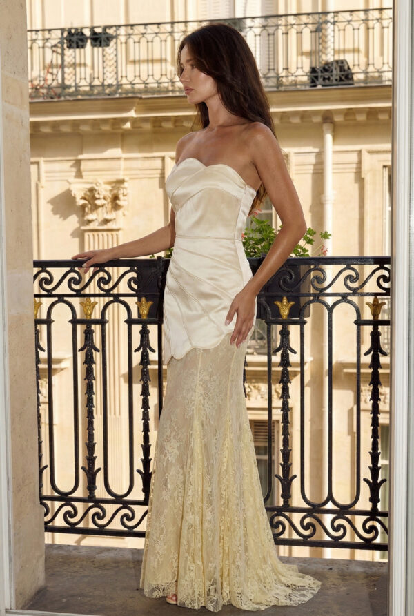 Elegáns, nőies maxi ruha, amely a letisztult szatén felsőrészt romantikus, áttetsző csipkeszoknyával ötvözi – tökéletes választás alkalmakra és különleges eseményekre.