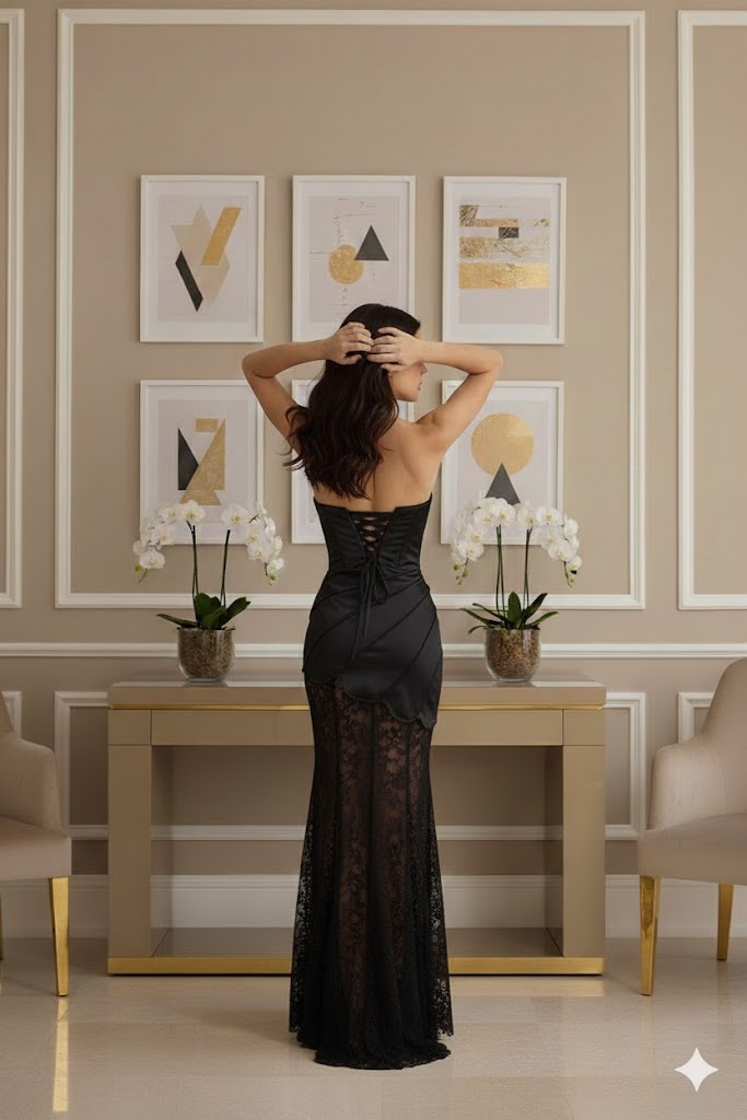 Az alsó rész áttetsző csipkéje légies, finoman nőies hatást kelt, amely mozgás közben is különleges megjelenést biztosít. A hátul fűzős kialakítás nemcsak dekoratív, hanem lehetővé teszi a ruha pontos méretre igazítását is, így szépen hangsúlyozza a derekat.