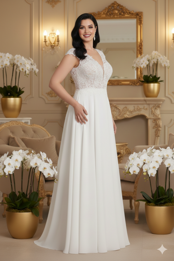 A könnyed muszlin anyag gyönyörűen lebeg mozgás közben, így a ruha egyszerre hat légiesnek és kifinomultnak. Az ekrü szín klasszikus, időtálló választás, amely nemcsak alkalmi eseményekre, hanem akár menyasszonyi ruhaként is ideális lehet egy letisztult, modern esküvőn.