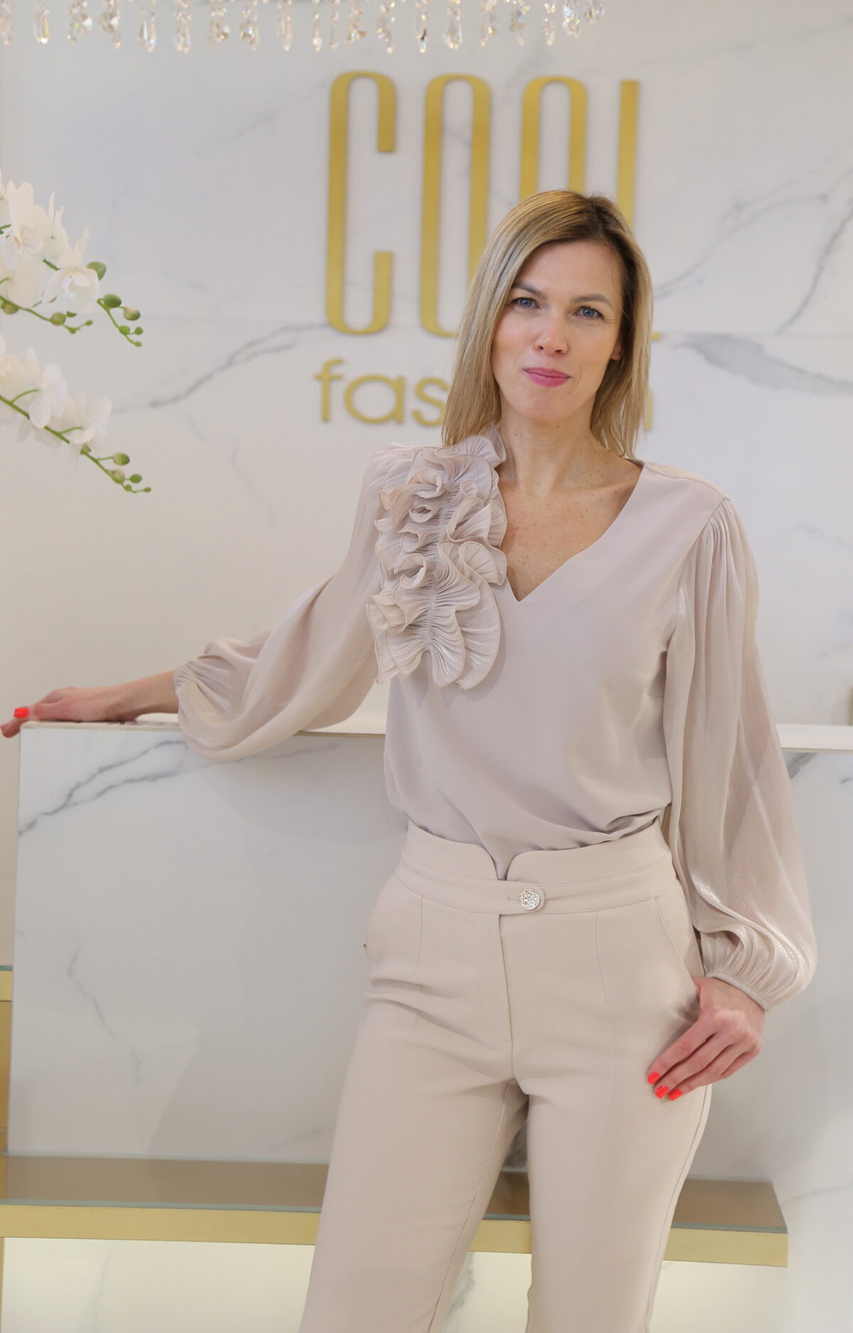 A blúz különlegességét az anyagában finoman csillogó muszlin ujjak adják, amelyek elegáns megjelenést kölcsönöznek a darabnak. A vállnál elhelyezett fodros díszítés nőies, romantikus karaktert ad, míg a gumírozott ujjvégek praktikus és kényelmes viseletet biztosítanak. Tökéletes választás elegáns nadrággal, szoknyával vagy akár farmerrel kombinálva is.