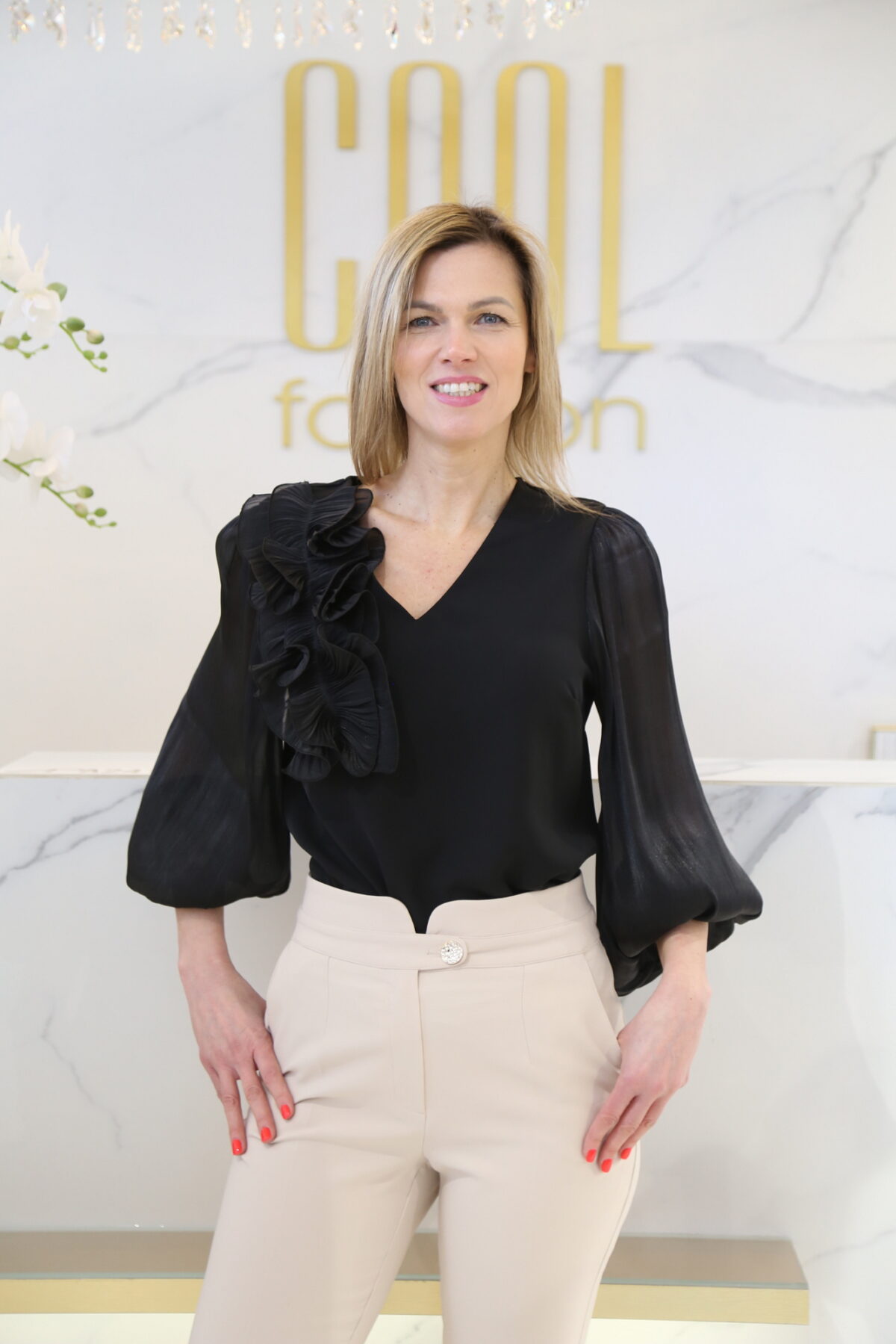 A blúz különlegességét az anyagában finoman csillogó muszlin ujjak adják, amelyek elegáns megjelenést kölcsönöznek a darabnak. A vállnál elhelyezett fodros díszítés nőies, romantikus karaktert ad, míg a gumírozott ujjvégek praktikus és kényelmes viseletet biztosítanak. Tökéletes választás elegáns nadrággal, szoknyával vagy akár farmerrel kombinálva is.