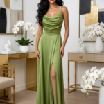 A spagetti pántos, kámzsás nyakú kialakítás modern és elegáns, miközben kényelmes viseletet biztosít. A hátul cipzáras megoldás praktikus és egyszerű felvételt tesz lehetővé, míg az elöl felsliccelt szoknyarész érzéki, ugyanakkor ízléses megjelenést kölcsönöz.