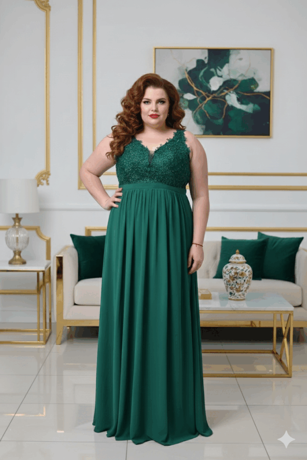 A Marella smaragdzöld muszlin maxi ruha tökéletes választás a molett hölgyek számára, akik szeretik a nőies, kifinomult megjelenést. A V-kivágású, push-upos mellrész kiemeli a dekoltázst, míg a horgolt csipke és gyöngyös díszítés exkluzív hatást kölcsönöz. Az elasztikus, gumis hátú kialakítás kényelmes viseletet biztosít.