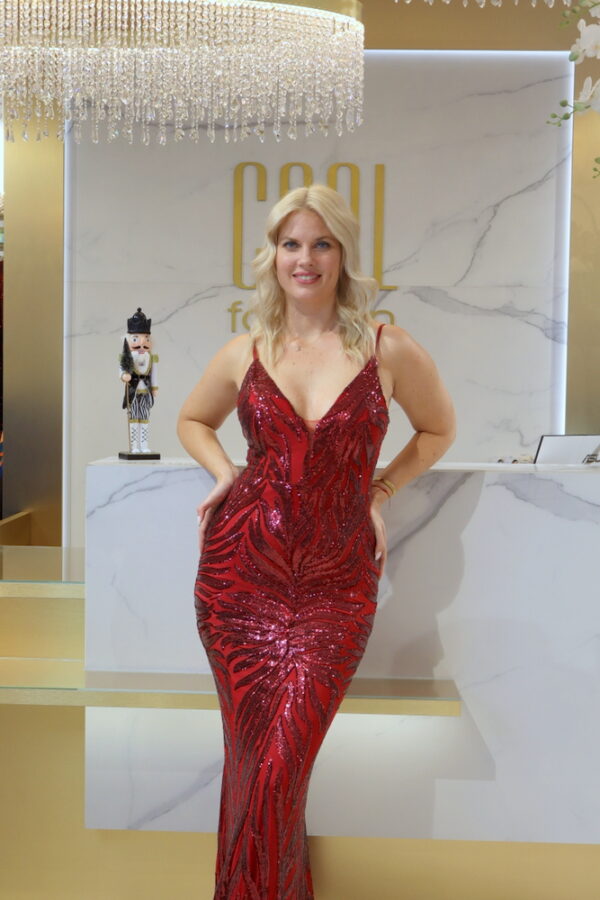 A teljes felületét borító bordó flitterek minden mozdulatnál tündöklő fényt adnak, így ideális választás ünnepi eseményekre, bálokra, fogadásokra vagy szilveszterre. A mély V nyakú, dekoltált fazon különösen nőies, míg a spagetti pántok finom, modern könnyedséget visznek a megjelenésbe.
