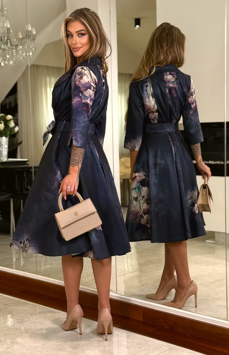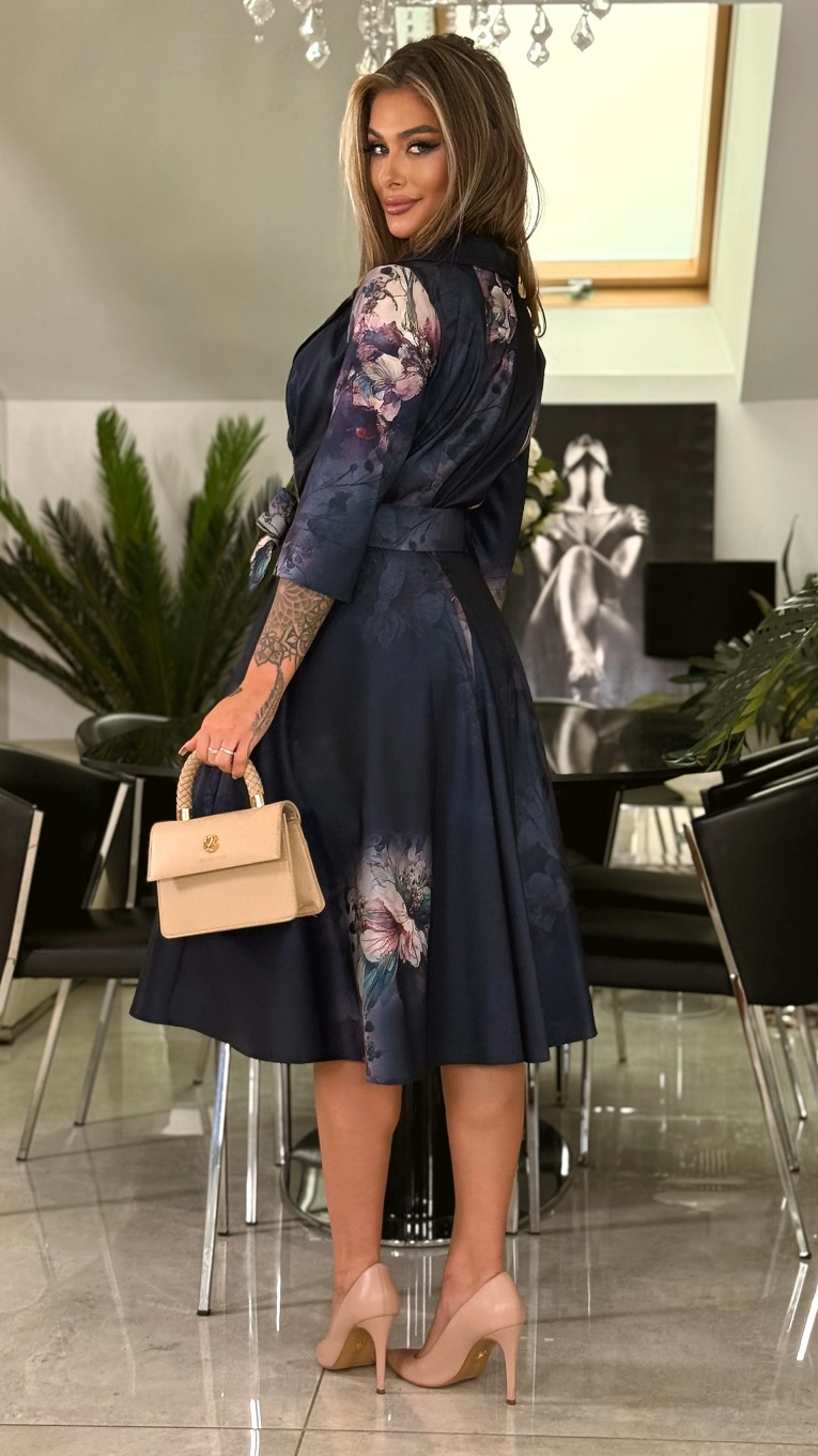 A Margó sötétkék virág mintás ruha elegáns és nőies megjelenést biztosít bármilyen különleges alkalomra. A klasszikus A-vonalú szabás, az átlapolt mellrész és a fényes arany mintázat együttese kifinomult, mégis kényelmes választássá teszi, akár örömanya ruhának is.