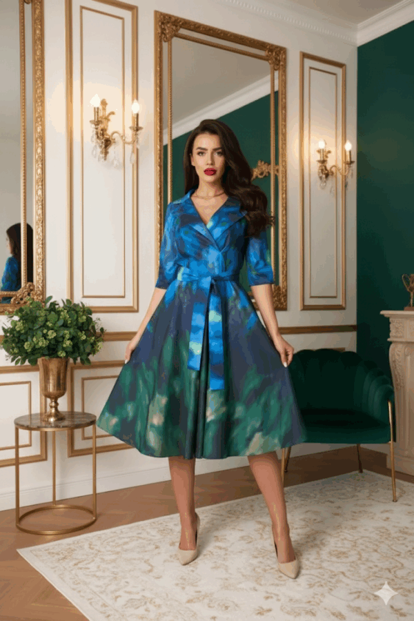 A Margó zöld-kék csíkos ruha tökéletes választás a mindennapi viselethez, amely egyszerre kényelmes és elegáns. A v-alakú mellrész és a háromnegyedes ujjú dizájn kiemelik a nőiességet, miközben a tüll betétes alsószoknya és az öv egyedi, formás megjelenést biztosít. A zsebes kialakítás praktikus és kényelmes, míg a hátul elhelyezett cipzár egyszerűsíti a felvételt.