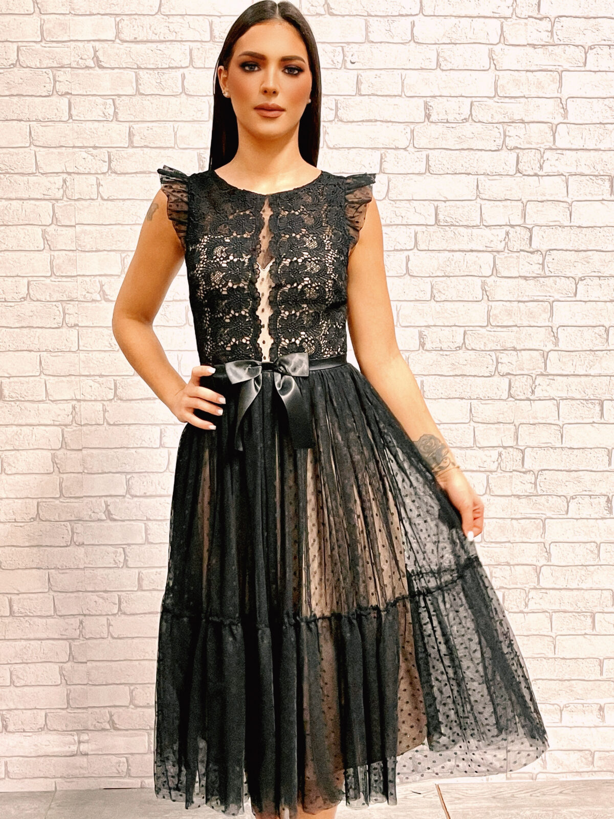 A Maribella fekete-nude midi pöttyös tüll ruha egy lenyűgözően nőies és elegáns darab, amely tökéletes választás különleges alkalmakra. A derékban szabott fazon és a loknis tüll szoknya romantikus és kifinomult megjelenést kölcsönöz.