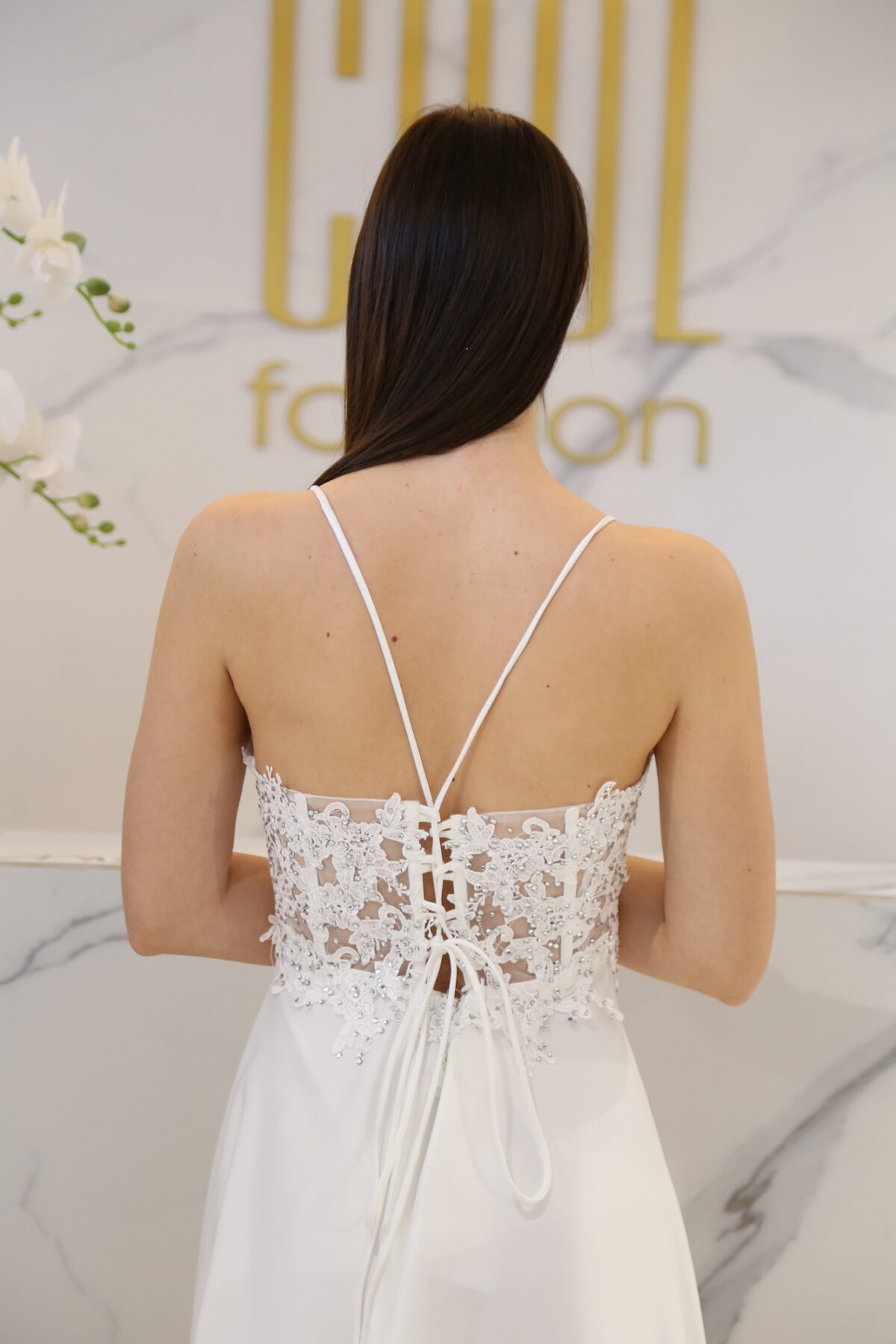 A hátul fűzős megoldás nemcsak dekoratív, hanem rendkívül praktikus is, hiszen egyénileg állítható, így tökéletes illeszkedést tesz lehetővé. A nem elasztikus anyag prémium érzetet ad, miközben megőrzi a ruha kifogástalan formáját.