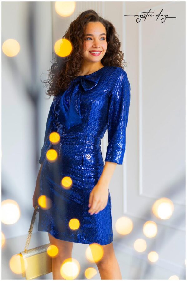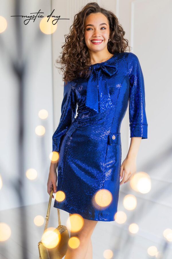 A Masnis flitteres ruha a szezon egyik legfényesebb és legnőiesebb darabja, amely garantáltan magára vonzza a tekinteteket. A kerek nyakrész letisztult keretet ad az arcnak, míg a nyaknál elhelyezett masni dísz különleges, romantikus hatást kelt, amely kiemeli a ruha eleganciáját.