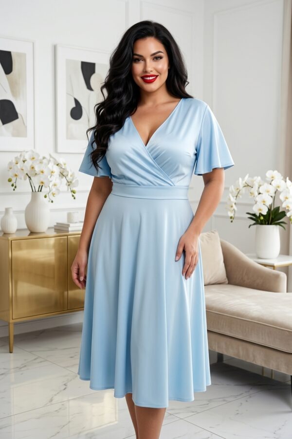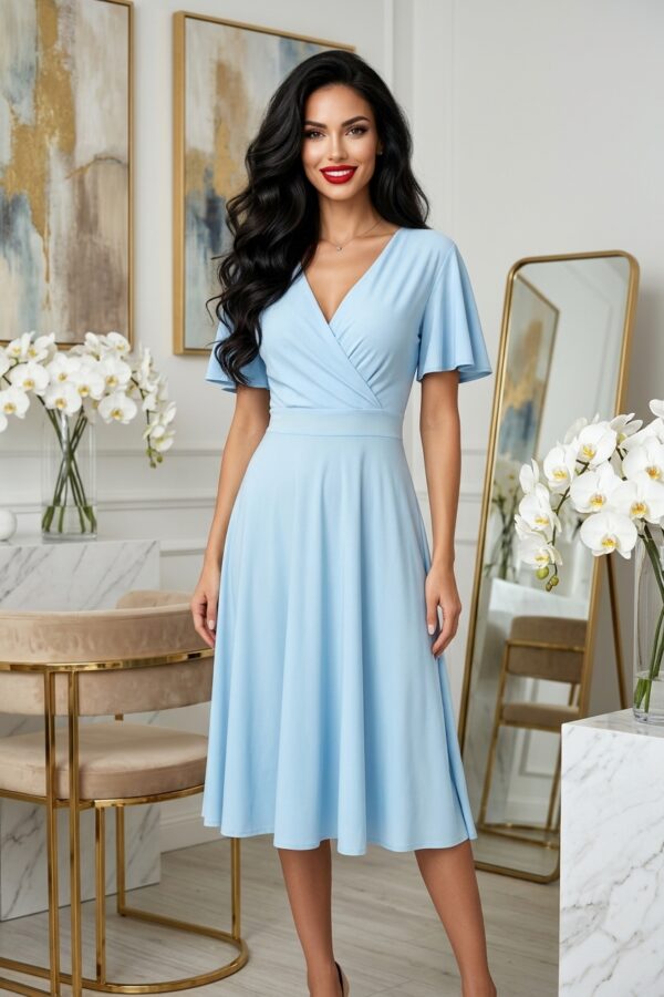 A Mely rövid ujjú midi ruha tökéletes választás, ha egy olyan darabot keresel, amely egyszerre elegáns és kényelmes. Az A-vonalú fazon és a derékban szabott kialakítás előnyösen formálja az alakot, miközben az átlapolt V nyakkivágás nőies, finoman szexi megjelenést ad.