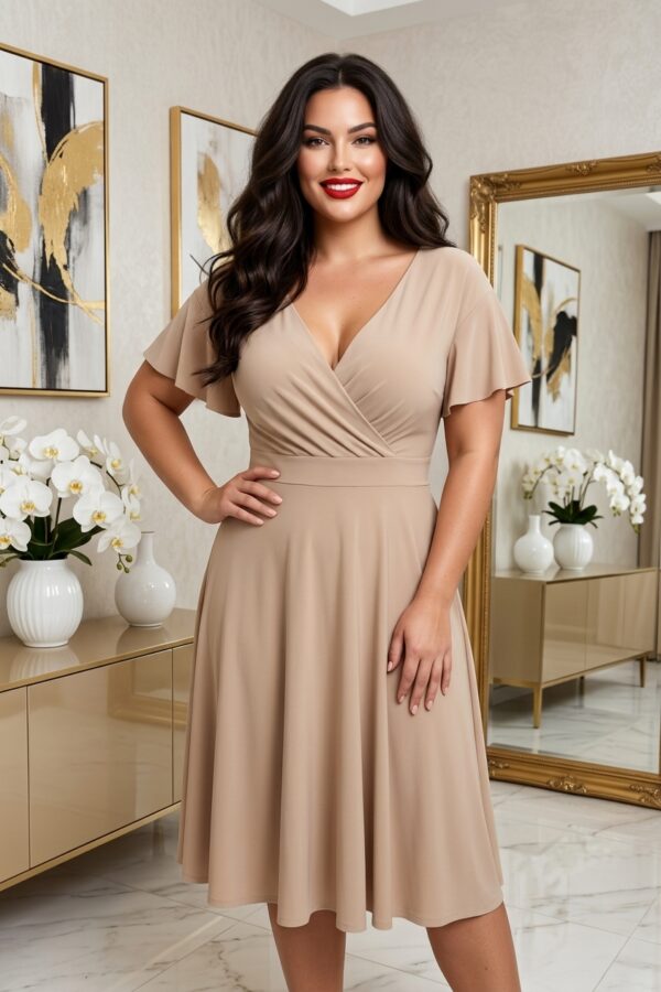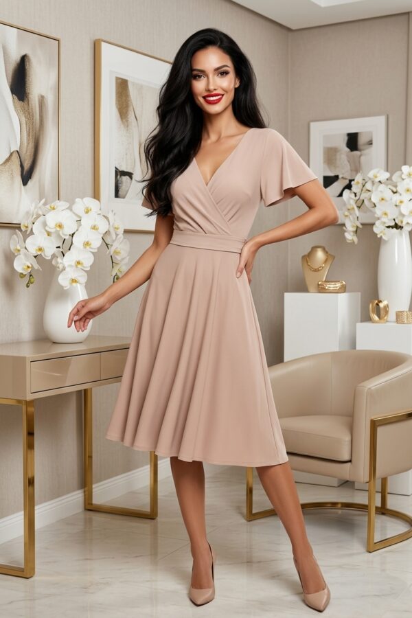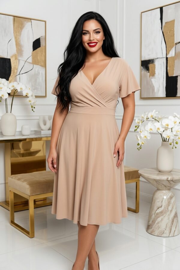 A Mely rövid ujjú midi ruha tökéletes választás, ha egy olyan darabot keresel, amely egyszerre elegáns és kényelmes. Az A-vonalú fazon és a derékban szabott kialakítás előnyösen formálja az alakot, miközben az átlapolt V nyakkivágás nőies, finoman szexi megjelenést ad.