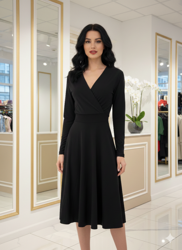 A Mely 3/4 ujjú midi ruha tökéletes választás, ha egy olyan darabot keresel, amely egyszerre elegáns és kényelmes. Az A-vonalú fazon és a derékban szabott kialakítás előnyösen formálja az alakot, miközben az átlapolt V nyakkivágás nőies, finoman szexi megjelenést ad.