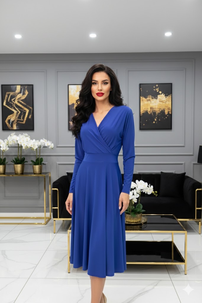 A Mely 3/4 ujjú midi ruha tökéletes választás, ha egy olyan darabot keresel, amely egyszerre elegáns és kényelmes. Az A-vonalú fazon és a derékban szabott kialakítás előnyösen formálja az alakot, miközben az átlapolt V nyakkivágás nőies, finoman szexi megjelenést ad.
