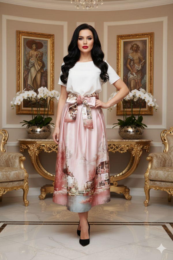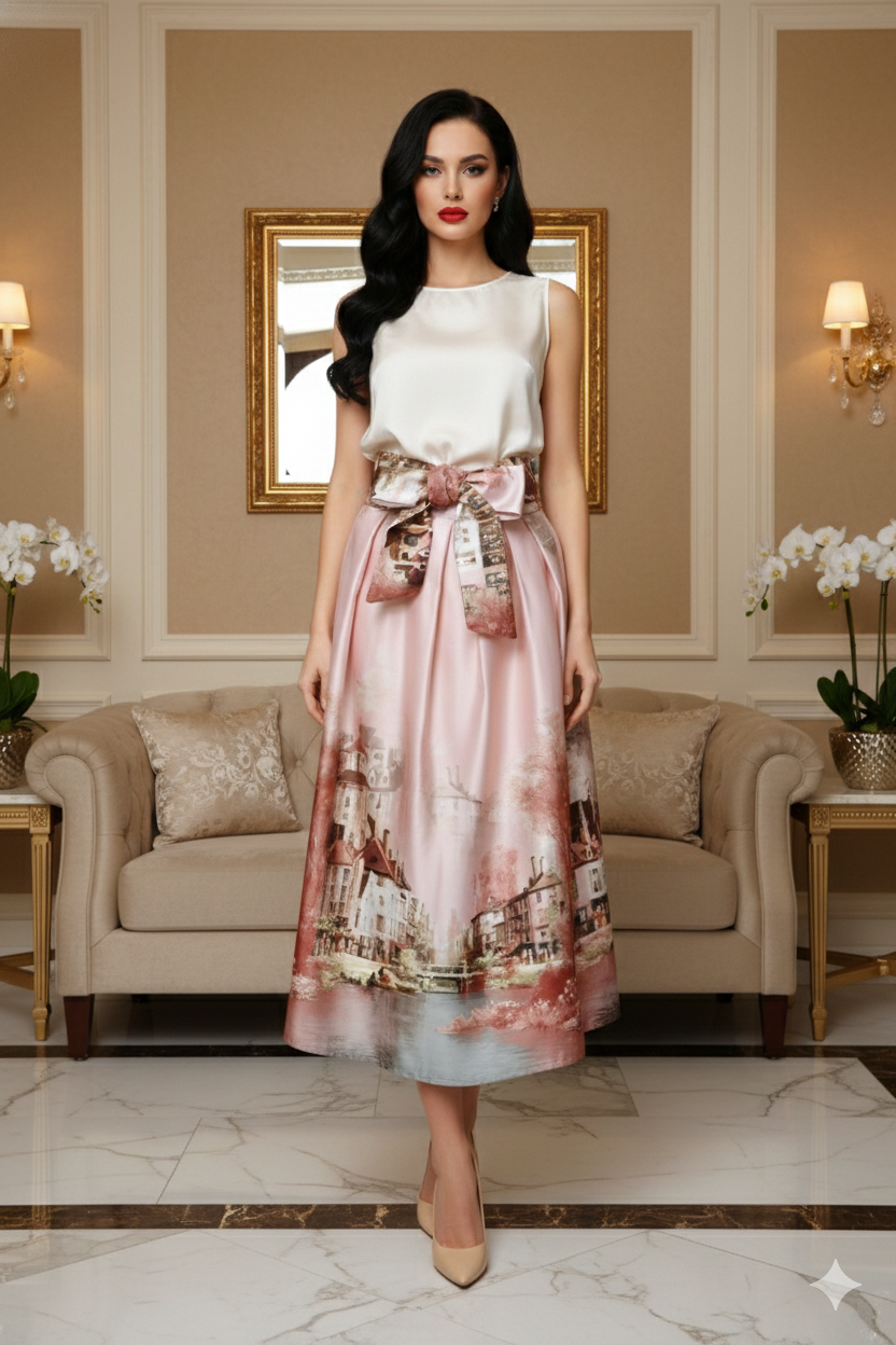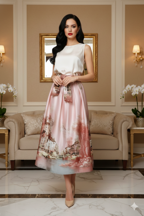Az A vonalú szabás előnyösen formálja az alakot, miközben szabad mozgást biztosít. Az öv bújtatós kialakítás lehetőséget ad arra, hogy egy stílusos övvel tovább hangsúlyozd a derékvonalat. A város minta romantikus, nőies hatást kelt, így a szoknya könnyedén viselhető hétköznapokon, de akár alkalmi eseményeken is.