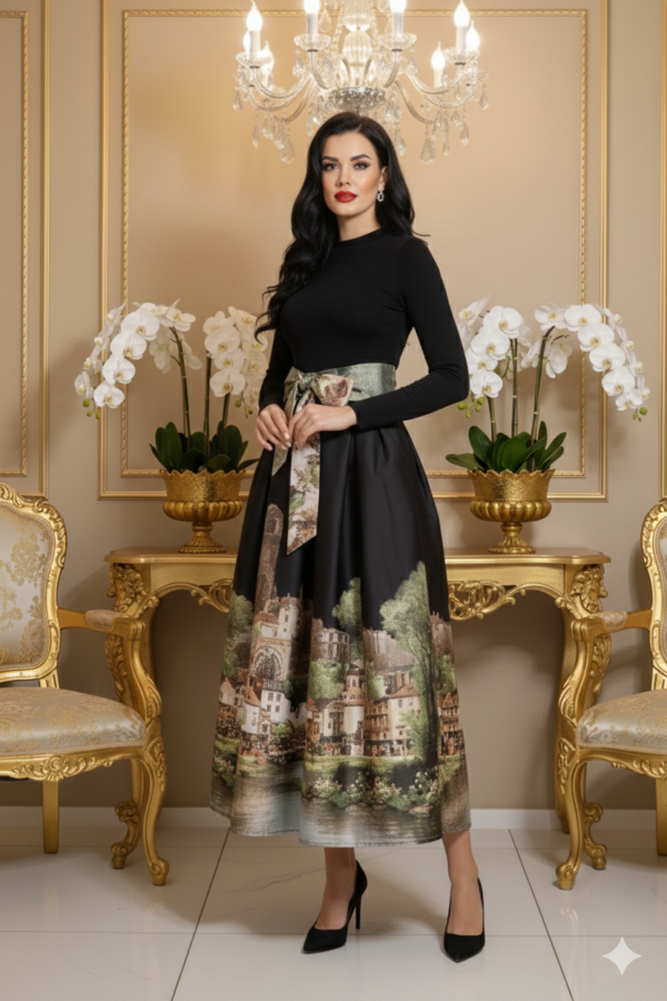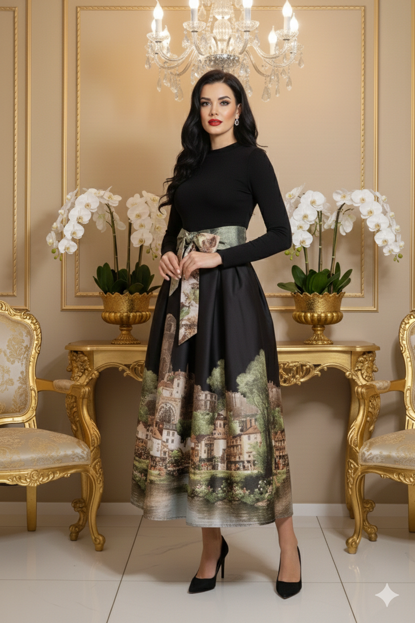 Az A vonalú szabás előnyösen formálja az alakot, miközben szabad mozgást biztosít. Az öv bújtatós kialakítás lehetőséget ad arra, hogy egy stílusos övvel tovább hangsúlyozd a derékvonalat. A város minta romantikus, nőies hatást kelt, így a szoknya könnyedén viselhető hétköznapokon, de akár alkalmi eseményeken is.