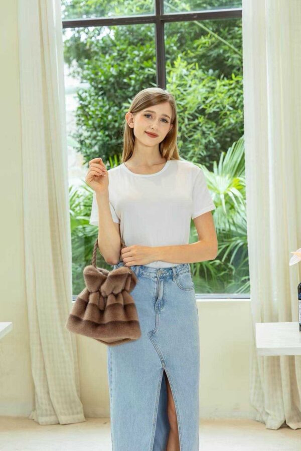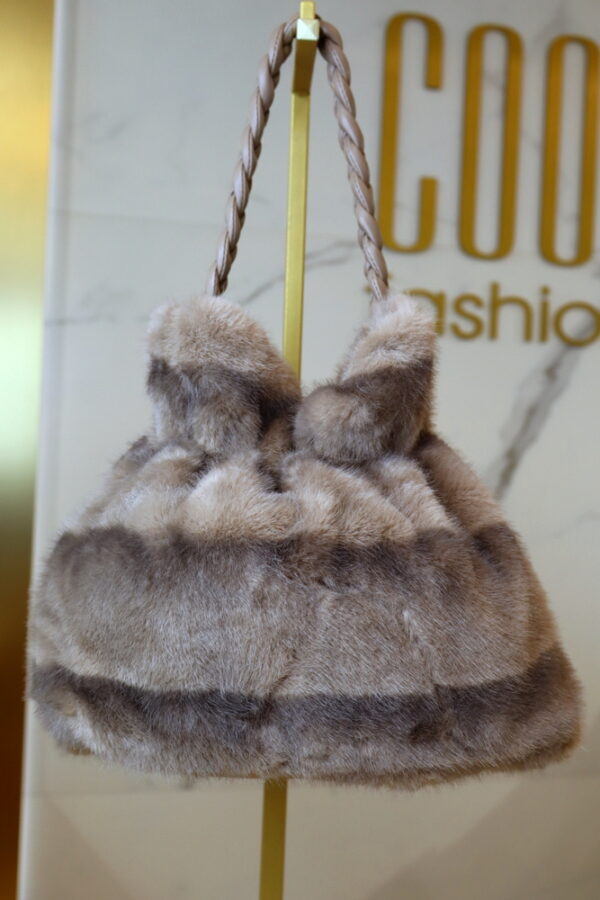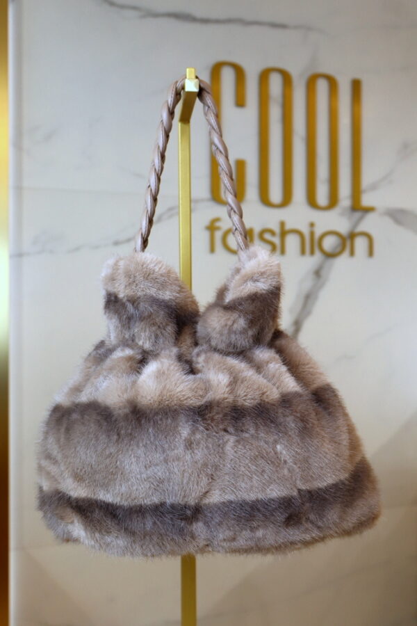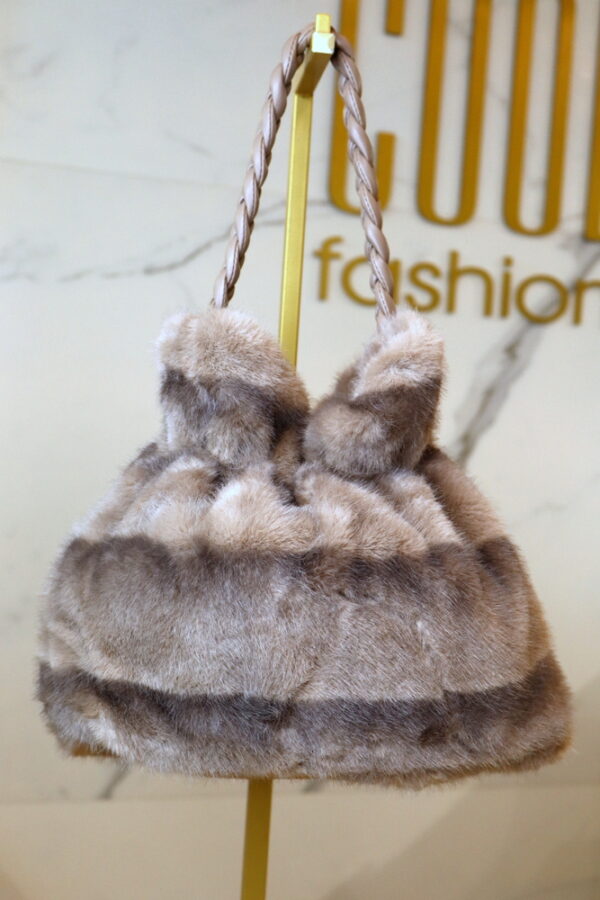 A Metta csíkos szőrmés batyu táska stílusos és praktikus kiegészítő, amely fonott fülrészével és arany lánccal elegáns, egyedi megjelenést biztosít.