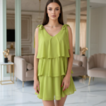 Üde, lime árnyalatú muszlin ruha romantikus fodrokkal és masnira köthető vállmegoldással – könnyed, nőies viselet tavasztól nyárig.