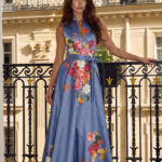 Elegáns, mégis könnyed maxi ruha látványos babakék virágmintával, amely nőiesen hangsúlyozza az alakot és tökéletes választás alkalmakra vagy nyári eseményekre.