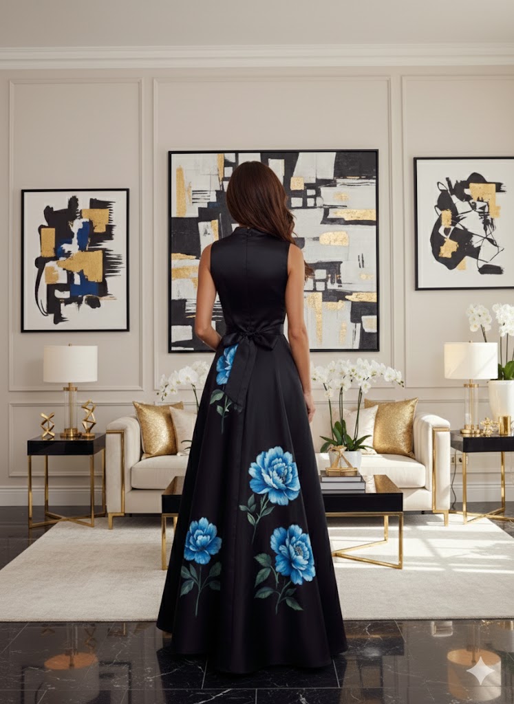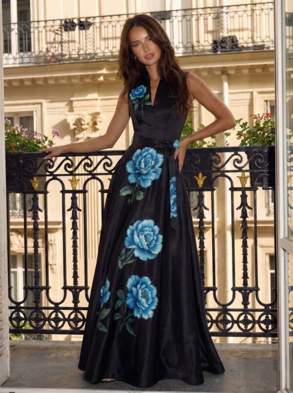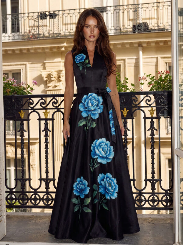 A ruha anyagával megegyező, megkötős öv – amely a ruha tartozéka – tovább erősíti a nőies vonalakat, az övbújtatós megoldás pedig gondoskodik arról, hogy az öv mindig a helyén maradjon. A maxi hossz elegáns esést ad, míg a fekete alapon megjelenő babakék virágminta igazán különleges, figyelemfelkeltő összhatást teremt.