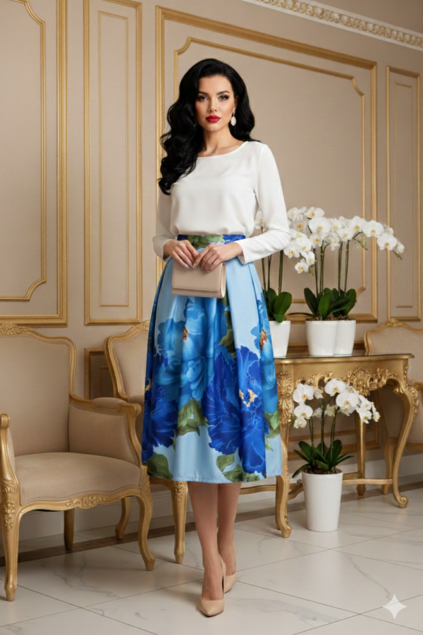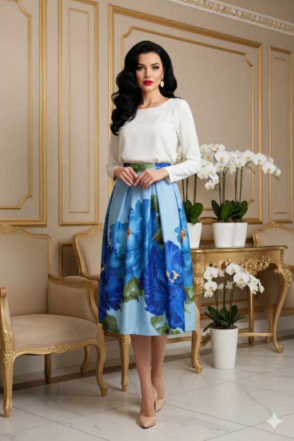 A alapon futó virágminta különleges és figyelemfelkeltő, amely elegáns blúzzal vagy egyszerű felsővel kombinálva is kifinomult szettet alkot. Ez a midi szoknya tökéletes választás lehet hétköznapi viselethez, irodába vagy különleges alkalmakra is.