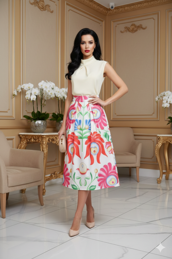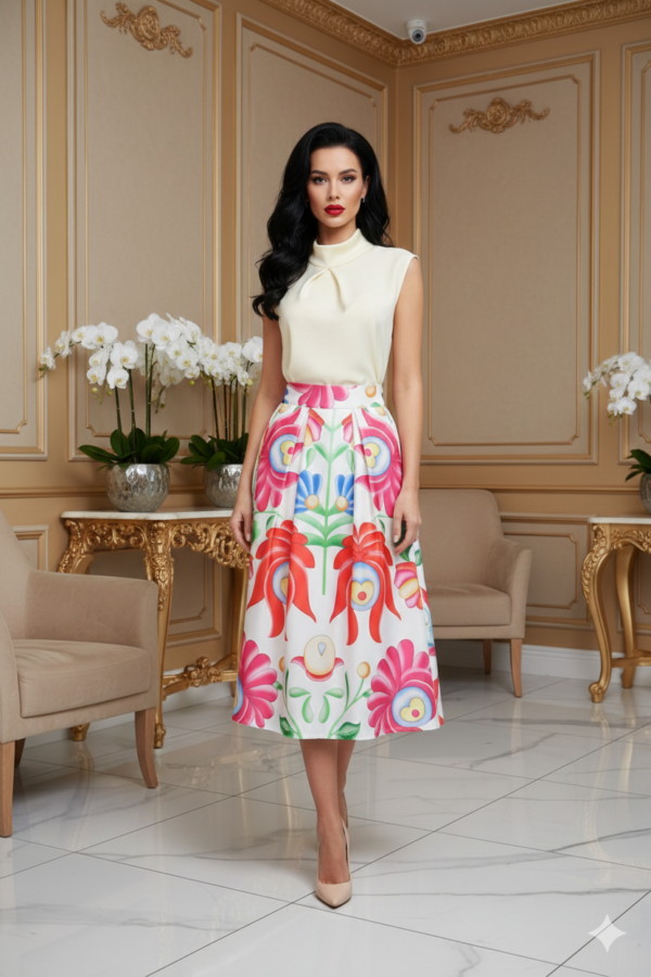 A Mirla virág mintás midi szoknya egy igazán elegáns és különleges darab, amely bármely alkalomra tökéletes választás. A rakott fazon romantikus és nőies megjelenést biztosít, míg a szatén anyag fényes esésével luxus hatást kelt.