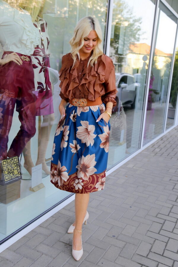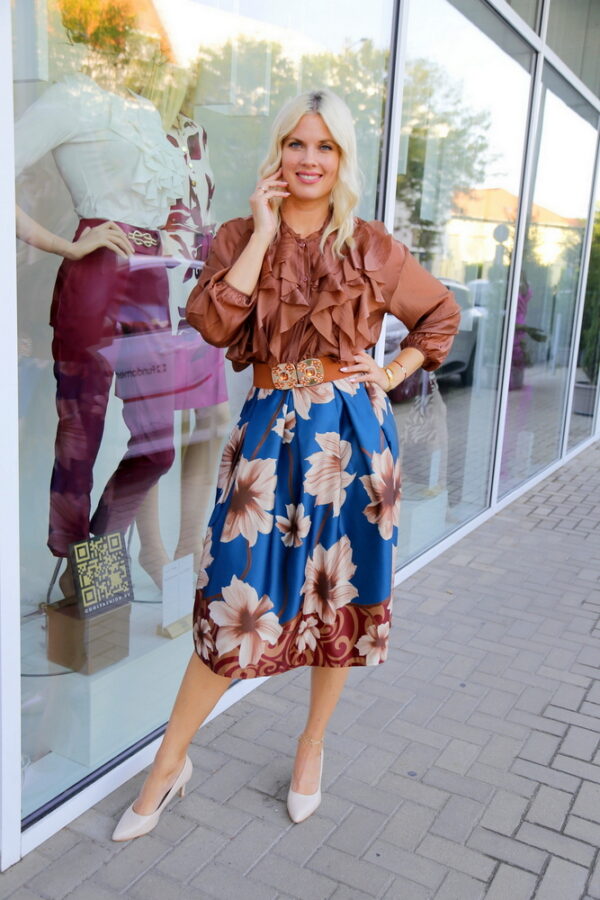 A petrol alapon futó virágminta különleges és figyelemfelkeltő, amely elegáns blúzzal vagy egyszerű felsővel kombinálva is kifinomult szettet alkot. Ez a midi szoknya tökéletes választás lehet hétköznapi viselethez, irodába vagy különleges alkalmakra is.