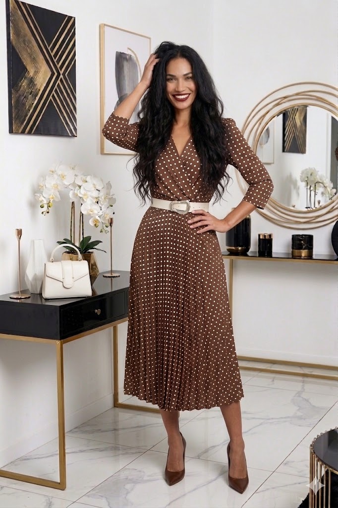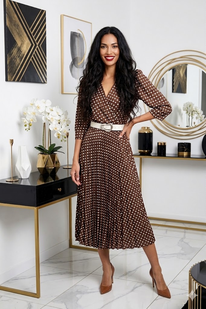 Szeretnél egy olyan ruhát, ami egyszerre romantikus és kifinomult, mégis könnyedén viselhető? Ez a pöttyös midi ruha a fényes anyagával és nőies szabásával azonnal rendezett, elegáns megjelenést ad – legyen szó irodai napokról, hétköznapi csinos szettekről, randiról vagy akár egy visszafogott alkalmi eseményről.