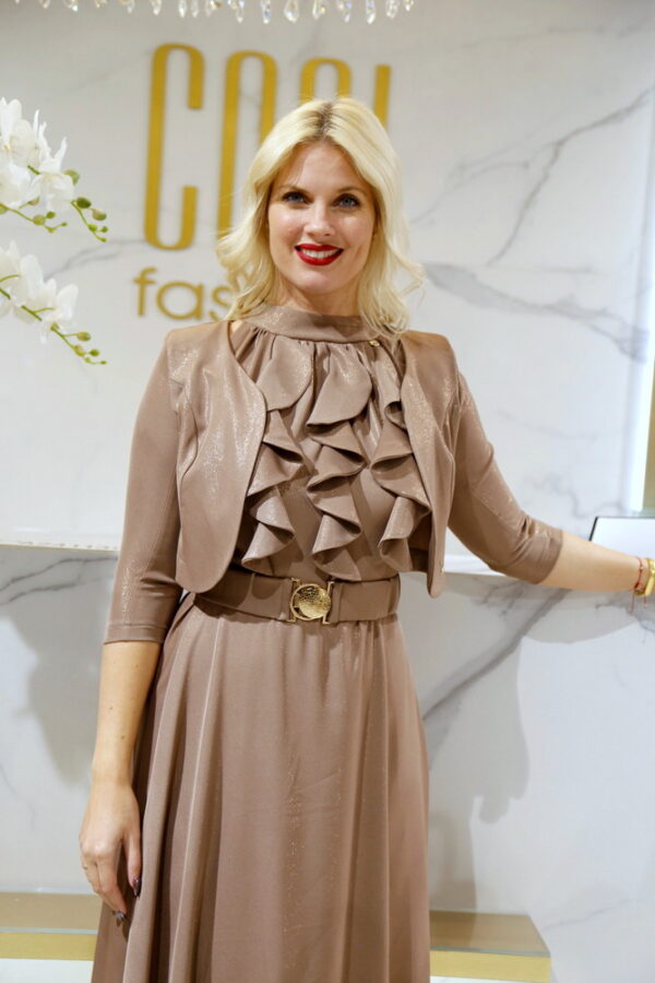 Ez az alkalmi boleró tökéletes választás, ha valami igazán elegáns és különleges alkalmi viseletre vágysz. A csillogós anyag és a háromnegyedes ujjú dizájn kombinációja minden megjelenést feldob. A váll töméses kialakítás pedig kiemeli a boleró eleganciáját, miközben kényelmes viseletet biztosít.