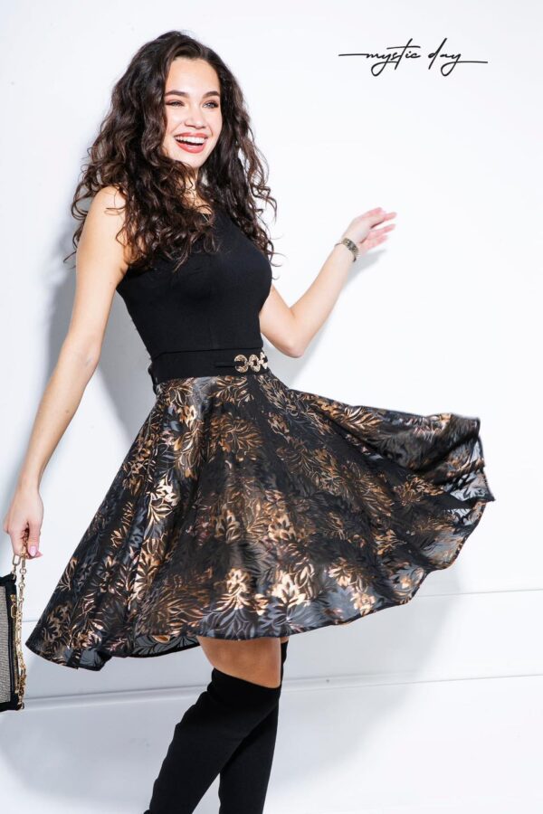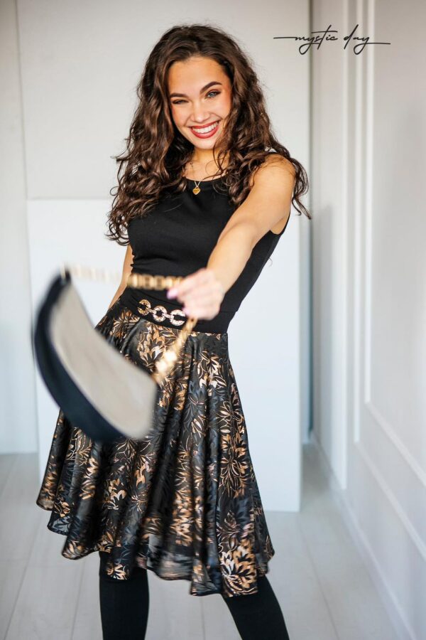 Az Annamíra fekete–arany mintás ruha a klasszikus elegancia és a különleges részletek harmonikus találkozása. A fekete felsőrész letisztult alapot ad, míg az arany mintás szoknyarész azonnal ünnepi, exkluzív megjelenést kölcsönöz. A deréknál elhelyezett arany övdísz finoman kiemeli a nőies vonalakat, miközben optikailag karcsúsít.